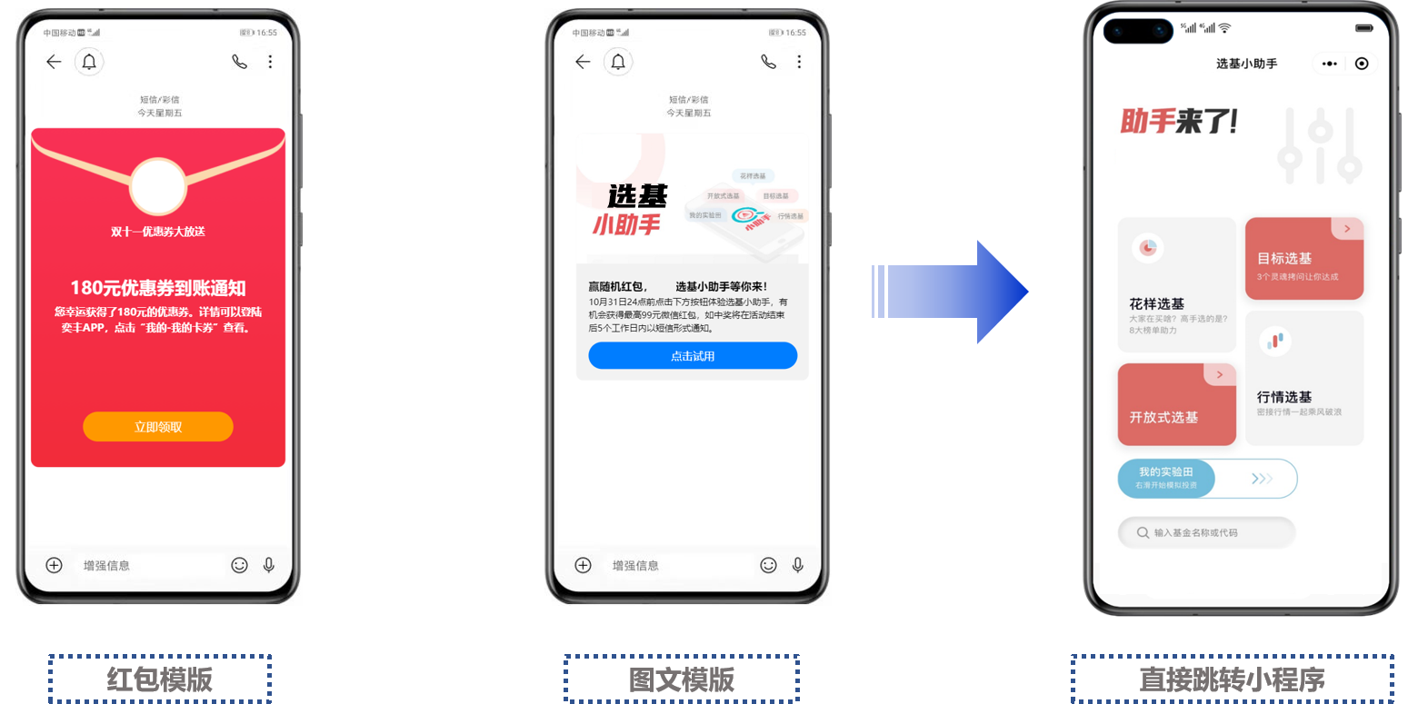 现在不管是APP还是小程序,拉新促活的成本都越来越高,尤其针对金融行业的用户运营来说,除了简单的引导用户下载APP,更重要是顺利获得运营手段激活用户,转化为有价值的用户。从这一点出发,凯发K8科技5G消息解决方案新增了多种样式的消息模板,支持采用图文+红包文案的方式助力基金行业高效拉新促活。